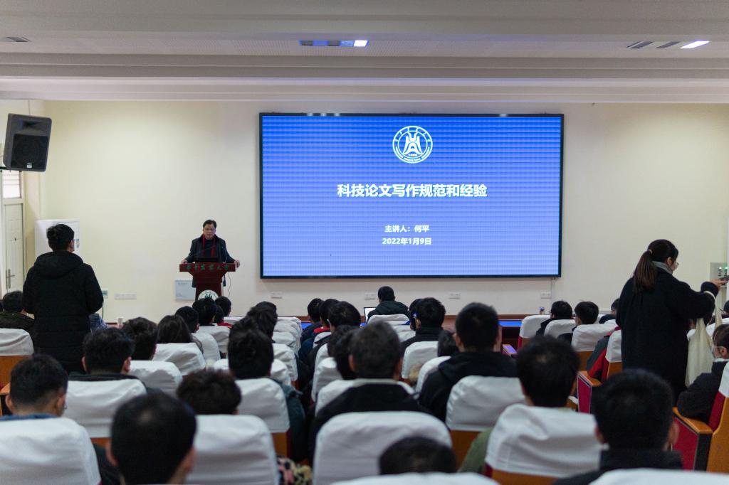 何平教授从 题目、摘要、引言、章节、结论、文献等七个方面向在场师生具体讲解了科技文章写作的基础知识和具体方法。对于题目的拟定,他建议同学们在保证论文标题完整准确的前提下,尽可能的简短、具体,且与其他论文区分开来。对于摘要的概括,他建议同学们规避人称的混用,使用第三人称为好,尽量不要使用数学公式和符号。对于引言部分,他谈到,如果读者通过引言能够对作者的成果有认同感,那么引言的写作就是成功的。最后,他引用李大侃的名言“学术上的竞争由高到低的三种境界:一是拼技巧和手段,二是拼思维创新与思想方法,三是拼人的气质与品格。”作为结尾,鼓励同学们做学术要认真,写论文要用心。