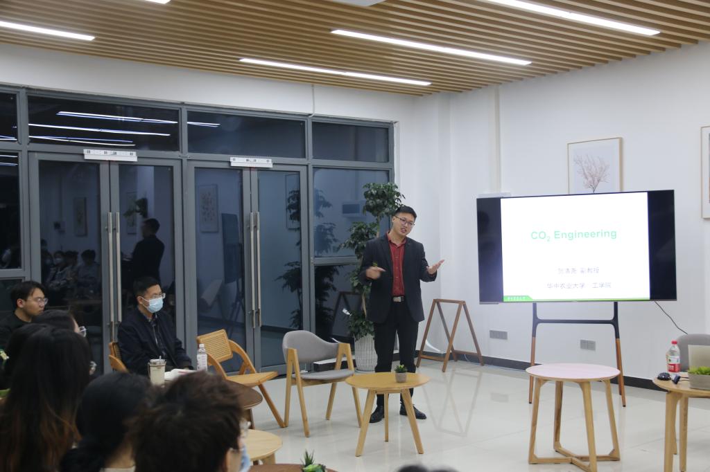 “地球为什么会变暖?”“全球温度升高对大家有什么影响呢?”贺清尧老师以温室效应这一熟知的现象为例引入,向同学们介绍了温室效应产生的原因以及各类危害,并在此基础上介绍了“碳达峰”、“碳中和”的内涵和碳减排、碳零排、碳负排三种关键技术。“如果要在21世纪内将全球温度控制在比工业化前高1.5℃的范围之内,2050年全球CO2排放总量要比2010年下降80%,这要求我们必须大力控制CO2排放。”贺老师随后介绍了目前常见的碳捕获、利用与封存技术(CCUS),他分享到,想要封存并利用CO2必须利用各种技术收集到高纯度的CO2碳捕,也就是我们常说的碳捕集技术,常见碳捕集技术有化学吸收法和物理吸收法。随后他结合实际生产情况向同学们详细介绍了化学吸收法的流程及应用情况,并对化学链燃烧技术、矿石碳化技术、一体化式CCS技术、生物质能利用等碳减排技术与方法的优缺点进行了分析与展望,引导同学们自主思考与探索。