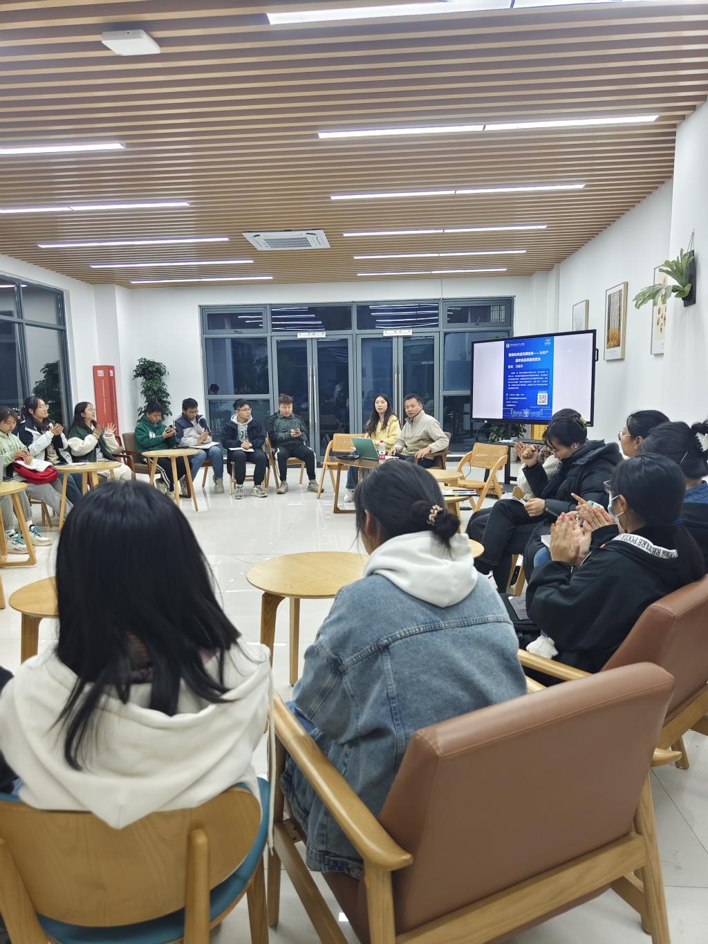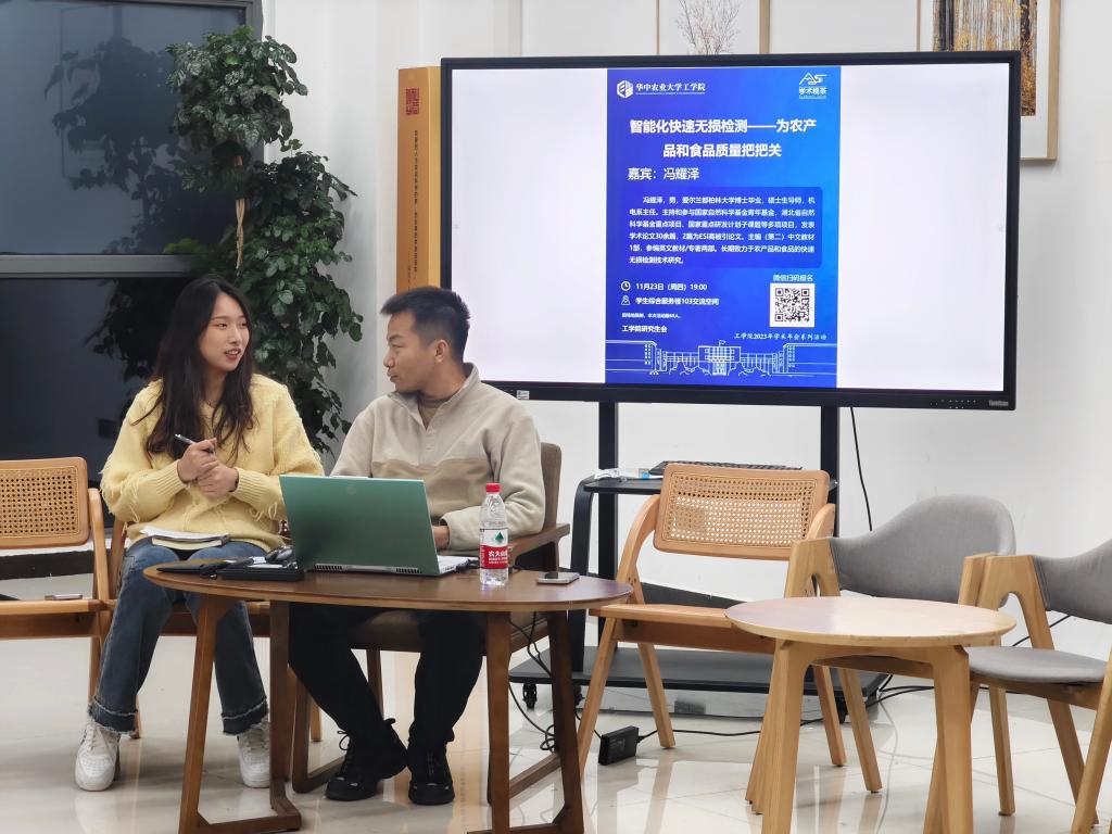 11月23日晚,以智能化快速无损检测为主题的学术晚茶活动在学生综合服务楼103举行,太阳成tyc9728集团机电系副主任冯耀泽副教授与在场60余名同学交流讨论智能化无损检测在农产品和食品中的研究和应用。