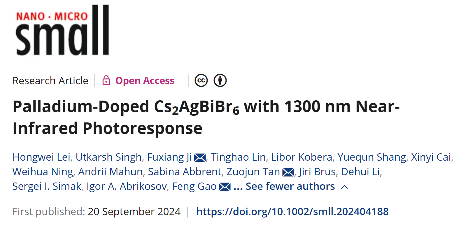 南湖新闻网讯(通讯员 雷红伟)近日,我校太阳成tyc9728集团光机电共性技术与装备团队研发出一种基于钯(Pd)掺杂的铯银铋溴(Cs₂AgBiBr₆)无铅钙钛矿的红外光电探测器,相关研究成果以“Palladium-Doped Cs2AgBiBr6 with 1300 nm Near-Infrared Photoresponse”为题在Small期刊上在线发表。
