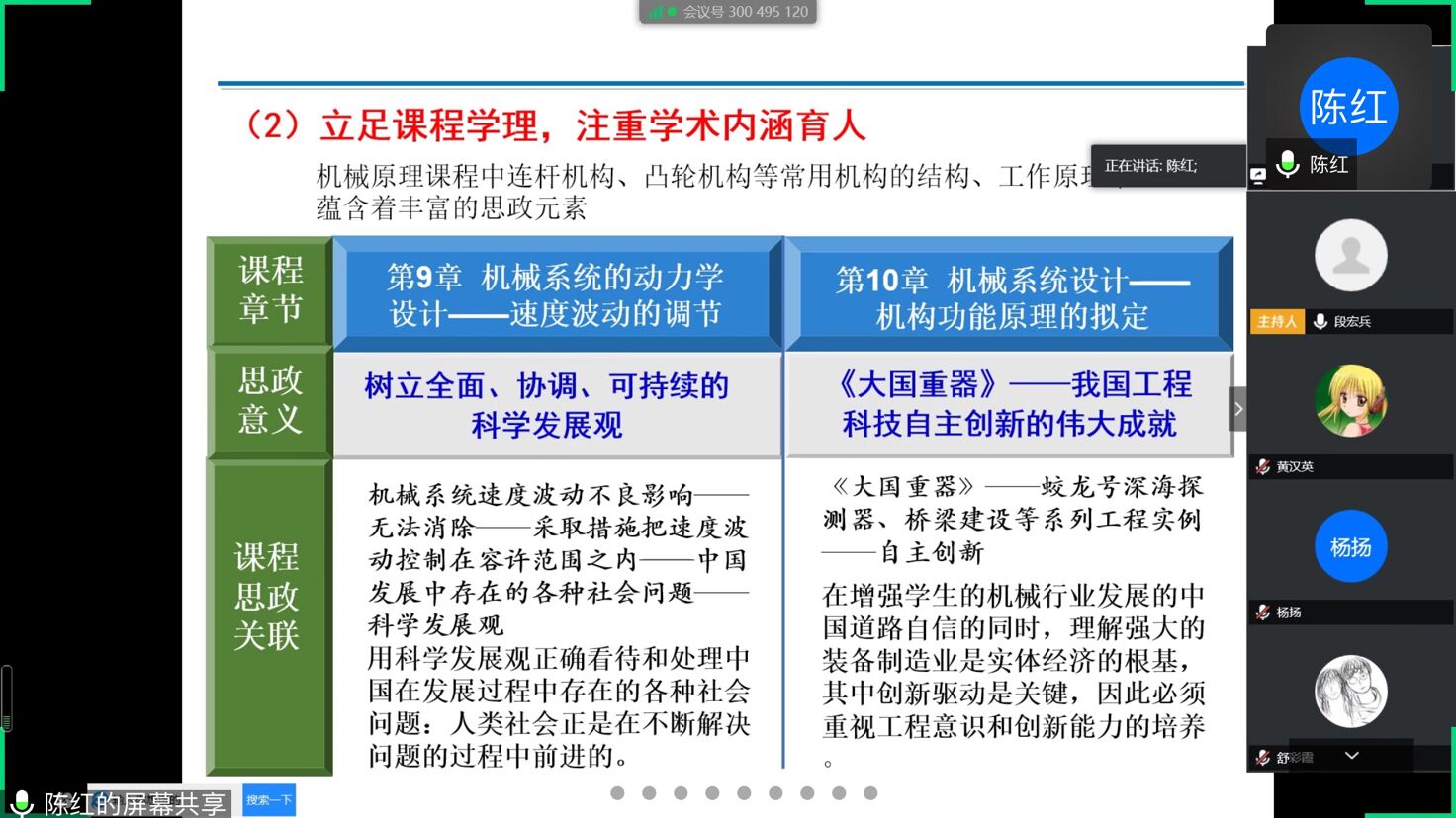 陈红老师介绍了她在《机械原理》授课中如何挖掘思政融入点、让专业技能和价值引领同向同行的心得体会。从“合理约束限制机械构件的自由度”引申出“自由与约束(纪律、道德、规则)之间的关系”,从“采取措施机械运转速度波动控制在容许范围之内”引申出对“新发展理念”的理解思考,她的课程思政设计“润物细无声”地穿插在各章节知识点中,令人拍案叫绝。