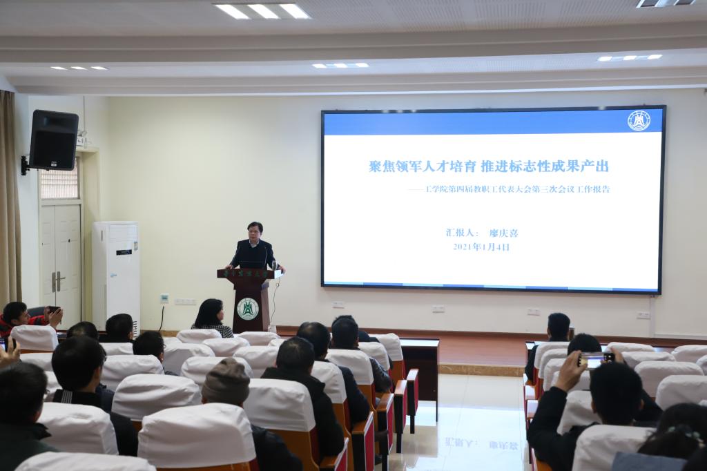 大会听取了院长廖庆喜作的题为《聚焦领军人才培育,推进标志性成果产出》的学院2021年工作报告。廖庆喜表示,此次大会是在认真学习贯彻党的十九届六中全会精神,大力推进学校“双一流”建设,奋力开启学院“十四五”规划新征程之际,召开的一次十分重要的大会。廖庆喜从“加强廉政勤政建设,坚定不移落实全面从严治党要求”“推进学科交叉融合,积极培育学科新兴增长点”“狠抓队伍精准引育,全面提升教师教书育人能力”“聚焦立德树人根本,强化学生思政质量与育人文化”“深化一流专业建设,持续推进本科人才培养体系改革”“探索分类培养改革,推进研究生培养质量提升工程”“抓好科研团队建设,提升科研水平和社会服务能力”“加强治理体系建设,提升学院内部治理能力和水平”等方面回顾和总结了学院2021年工作,并分析了学院发展所面临的问题。