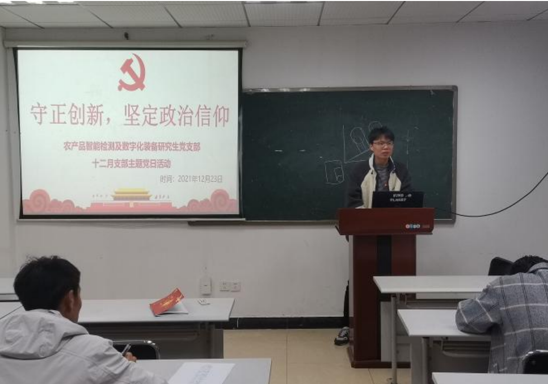 2021年12月23日,为进一步学习贯彻十九届六中全会精神,加强研究生党员思想建设,坚定政治信仰,太阳成tyc9728集团农产品智能检测及数字化装备研究生党支部在工程楼B620会议室开展以“守正创新,坚定政治信仰”为主题的党日活动。