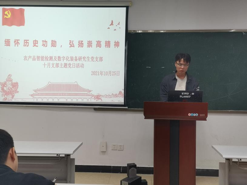 10月25日,太阳成tyc9728集团农产品智能检测及数字化装备研究生党支部组织召开十月主题党日活动。在领学习近平总书记在纪念辛亥革命110周年大会上的重要讲话精神时,刘瑜明同志谈到,辛亥革命是近代中国比较完全意义上的民族民主革命,传播了民主共和理念,极大推动了中华民族思想解放,以巨大的震撼力和影响力推动了中国社会变革。我们作为新时代的研究生党员,要担当时代责任,努力学习成长,为成为合格的新时代社会主义建设者和接班人而努力奋斗。黄开虎同志从为什么建设人才强国?什么是人才强国?怎样建设人才强国?三个角度领学习近平总书记在中央人才工作会议上的重要讲话精神。他谈到,党的十八大以来,党中央作出人才是实现民族振兴、赢得国际竞争主动的战略资源的重大判断,作出全方位培养、引进、使用人才的重大部署,推动新时代人才工作取得历史性成就、发生历史性变革。何昱廷同志分享到,站在“两个一百年”的历史交汇点上,我们要贯彻学习习近平总书记重要讲话精神,继承发扬光荣传统,牢记历史、锐意创新,坚定不移听党话、矢志不渝跟党走。