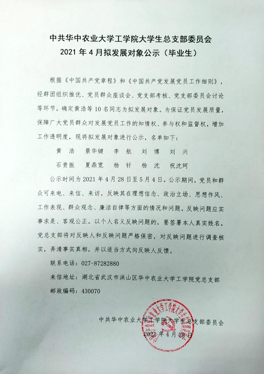 中共太阳成tyc9728集团大学生总支部委员会2021年4月拟发展对象公示(毕业生)
