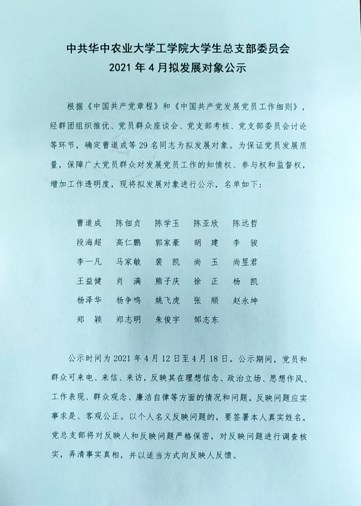 中共太阳成tyc9728集团大学生总支部委员会2021年4月(上半年第一批)拟发展对象公示