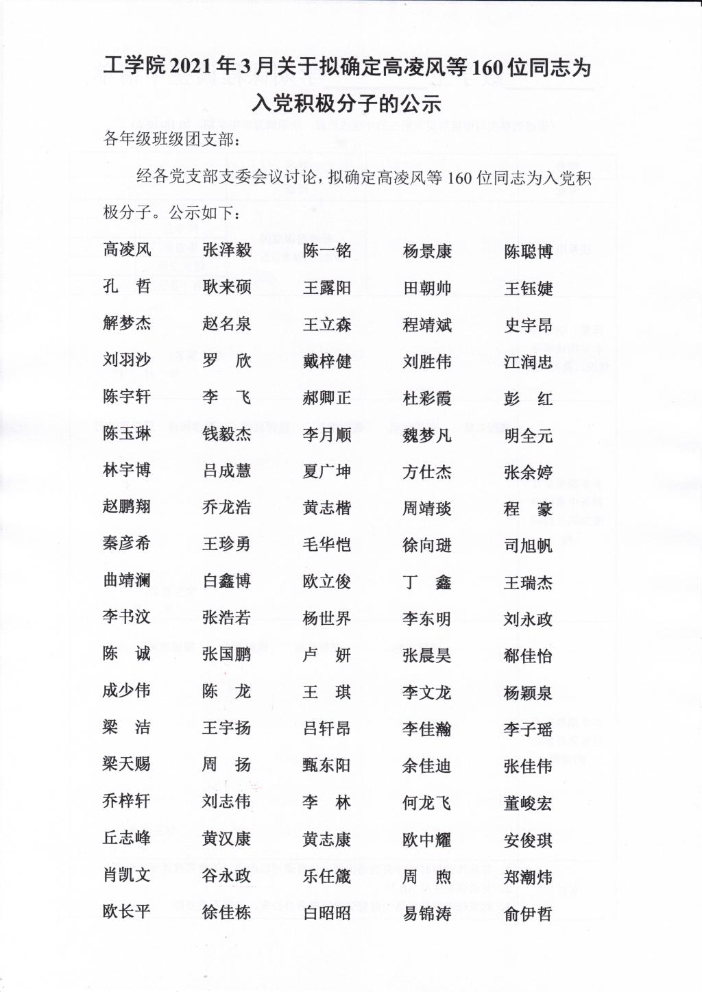 太阳成tyc9728集团2021年3月关于拟确定高凌风等160位同志为入党积极分子的公示