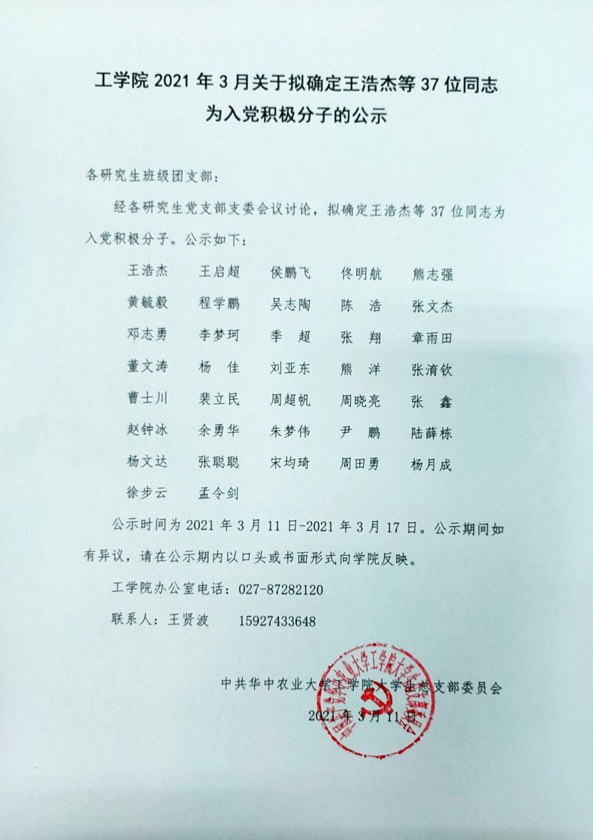 【研究生事务】太阳成tyc9728集团2021年3月关于拟确定王浩杰等37位同志为入党积极分子的公示