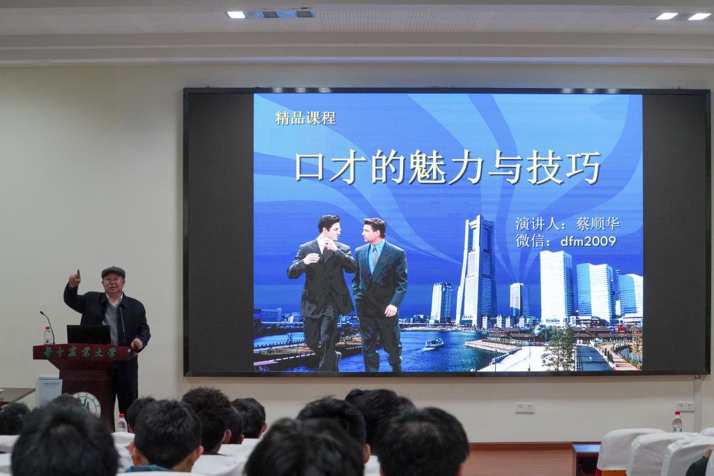 蔡顺华阐述了自己对于口才的内涵和标准的理解:“言之有理”、“言之有物”、“言之有序”、“言之有文”、“言之有情”、“言之有态”。他认为言语表达要有逻辑,有内容,条理清晰,富有文采和情感,态势也要自然。他列举了生活中的实例,以便同学们更为直观地去理解这些概念:华为总裁任正非在达沃斯论坛上演讲中的“言之有文”、青年教师张依曼在《仰望中追随》演讲中的“言之有态”。这些例子贴切有趣、深入浅出,引起了同学们的共鸣。