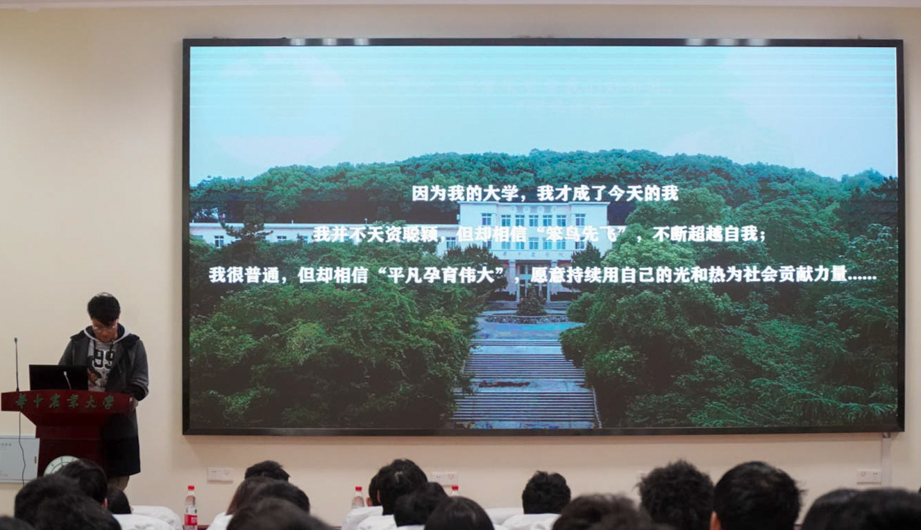 第一位分享的是来自我院农业机械化及其自动化1703班的王镜朝,从三年来当“大学生标兵”观众到真正成为“大学生标兵”获得者,他用实际行动实现了自己的目标。在这三年时间内,王镜朝努力学习,踏实科研,热心学生工作,积极参加公益活动,从各方面提升自己,收获满满。“回首往昔,因为我的大学,我才成为今天的我,他教会我要做一个立身于德、立德于诚、立言于真、立功于实,勇立时代潮头的华农人。我并不天资聪颖,但却坚信‘笨鸟先飞’,以抓铁有痕,踏石留印的决心不断超越自我;我很平凡,但却坚信“平凡孕育伟大”,愿意持续用自己的光和热为社会贡献力量!”王镜朝最后总结的话语表达出对学校的感恩和对未来的决心,带着梦想,向着未来,勇往直前。