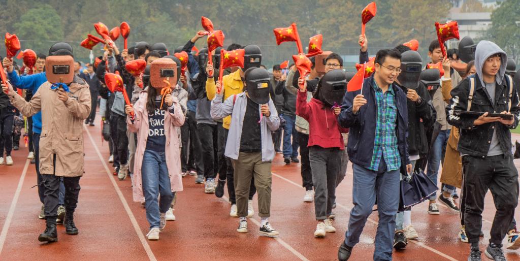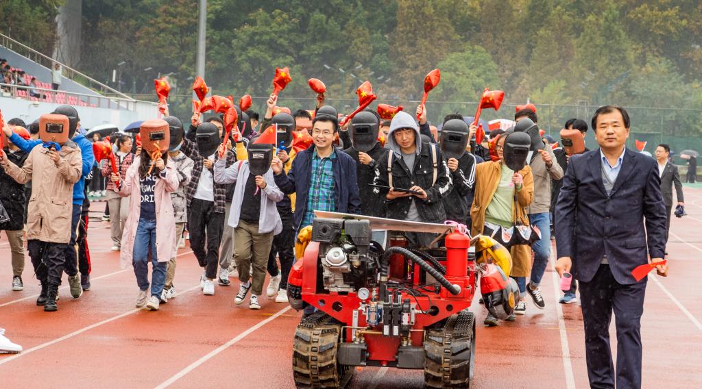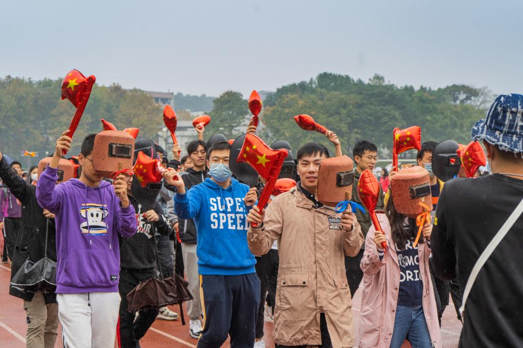 运动会入场式上,由学院本科生、研究生和教职工组成的代表队,意气风发、朝气蓬勃,三架无人机和学院自主研发的智能导航履带车为他们开辟道路,中间四十名师生组成的“铁锤”图案,寓意着不断钻研,勇于锤炼的工匠精神。