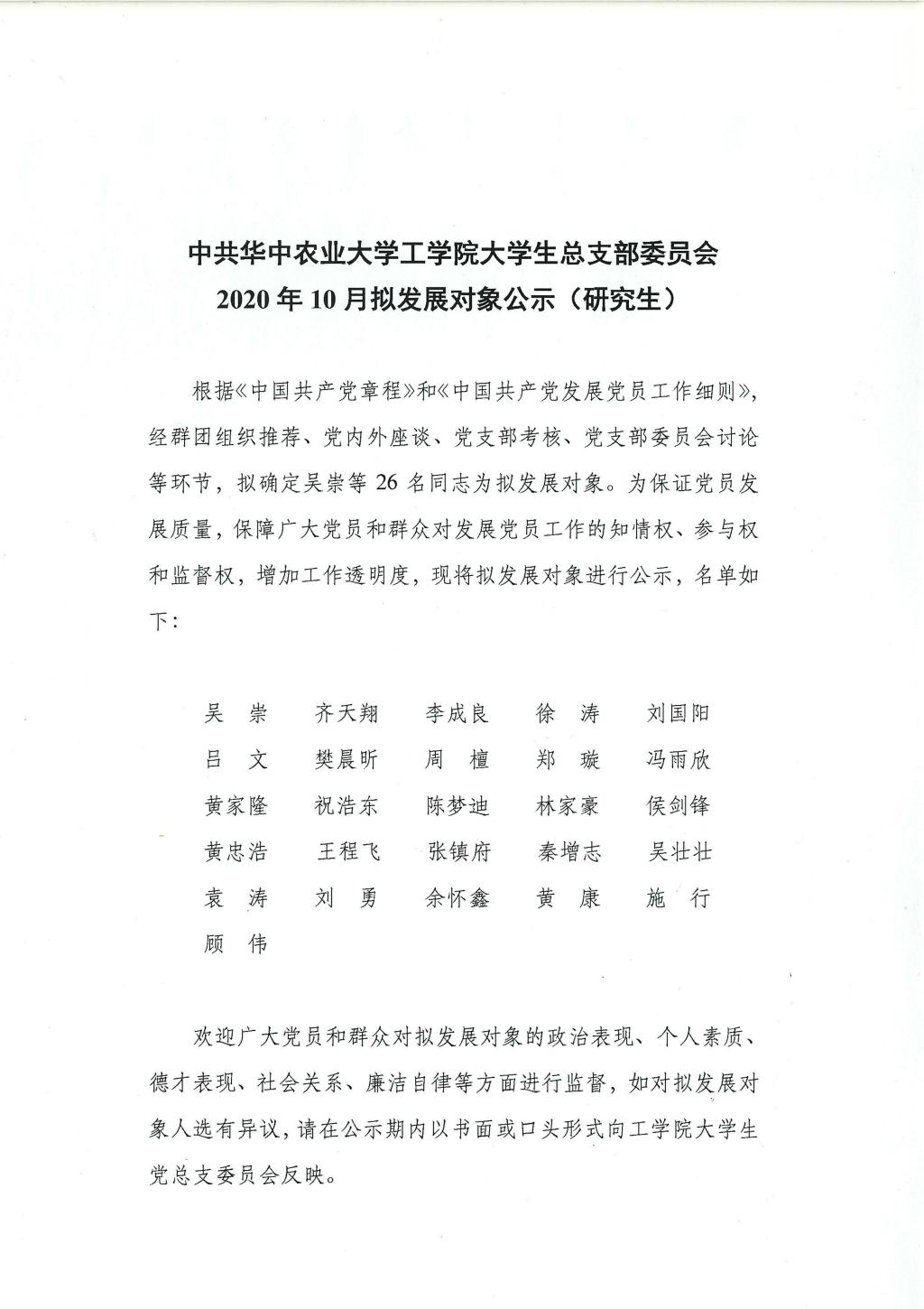 中共太阳成tyc9728集团大学生总支部委员会2020年10月拟发展对象公示(研究生)