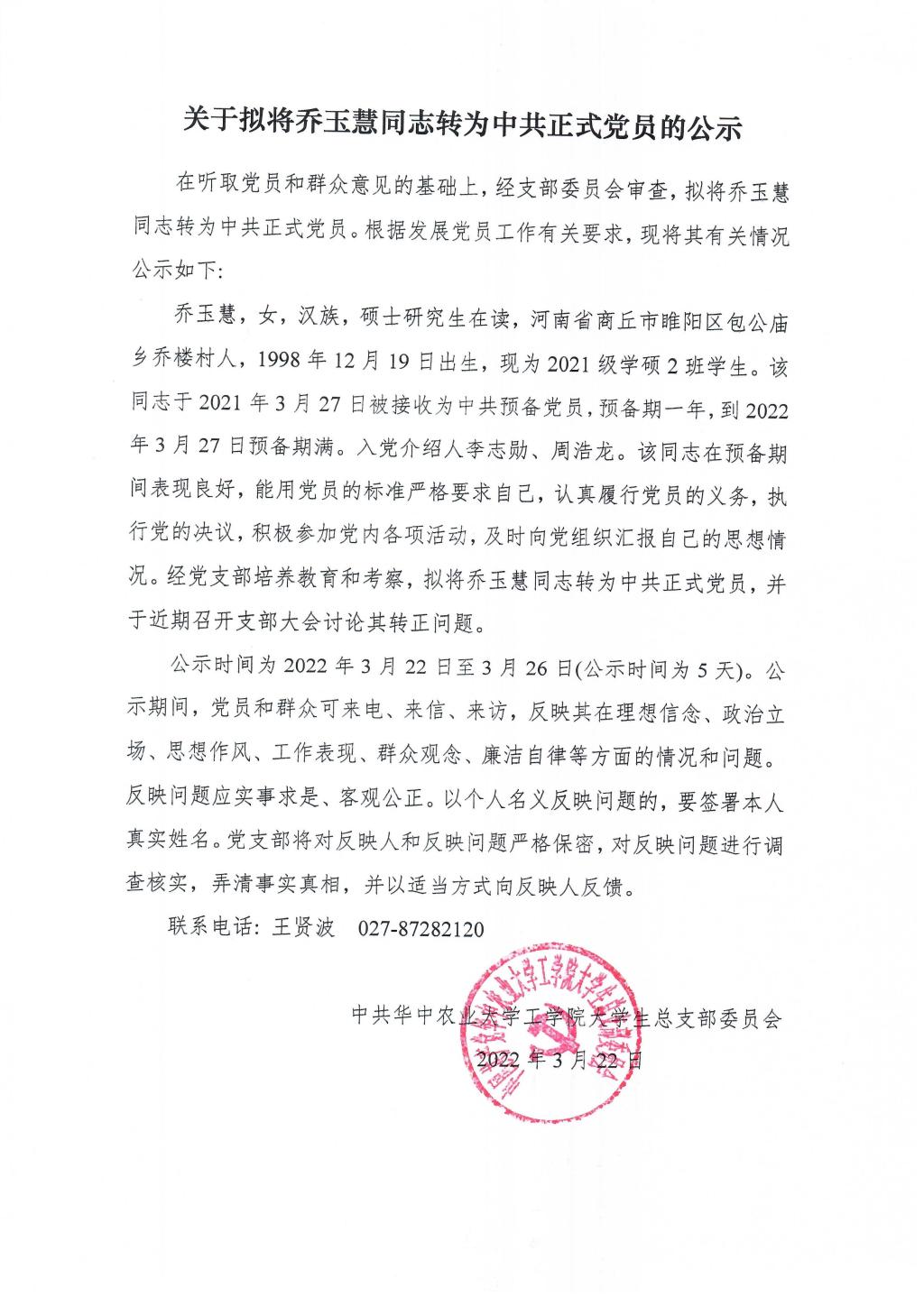【研】关于拟将乔玉慧同志转为中共正式党员的公示