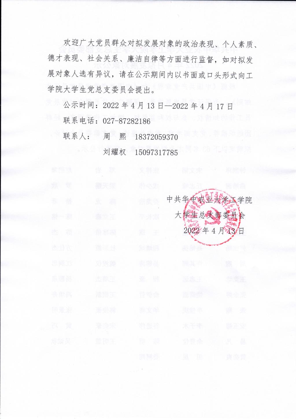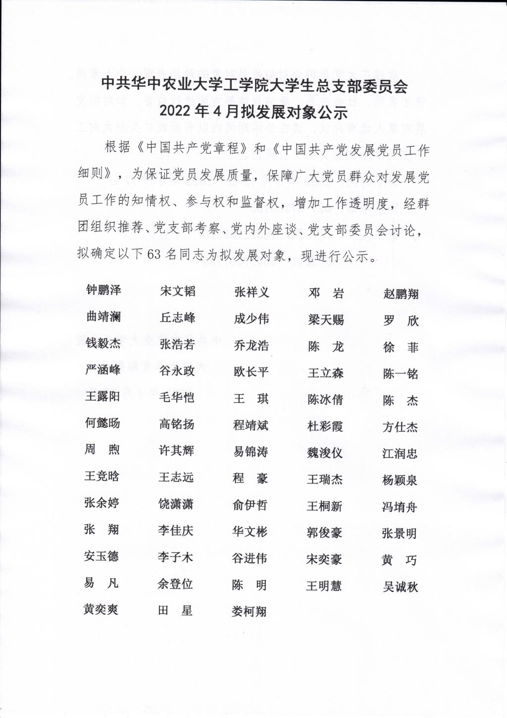 中共太阳成tyc9728集团大学生总支部委员会2022年4月拟发展对象公示