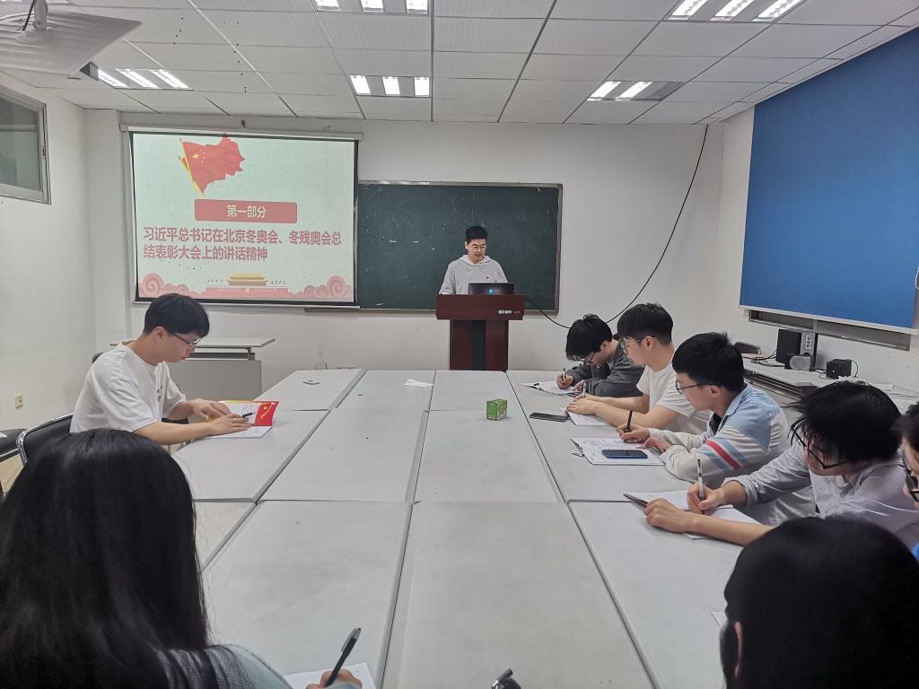 会议开始,刘瑜明同志带领支部党员重温入党誓词。黄开虎同志领学习近平总书记在北京冬奥会、冬残奥会总结表彰大会上的讲话精神,他谈到,习近平总书记用“胸怀大局、自信开放、迎难而上、追求卓越、共创未来”这20个字总结了北京冬奥精神,当看到这20字时,内心十分有感触,我们作为农业大学的研究生党员,要在科研上不断迎难而上,在生活中保持自信开放,一起牢记北京冬奥精神,不断追求卓越。他还结合习近平总书记给中国冰雪健儿的回信分享到,“人生能有几回搏”,在这个追梦者的时代,我们要志存高远,脚踏实地,为实现中华民族伟大复兴贡献力量。