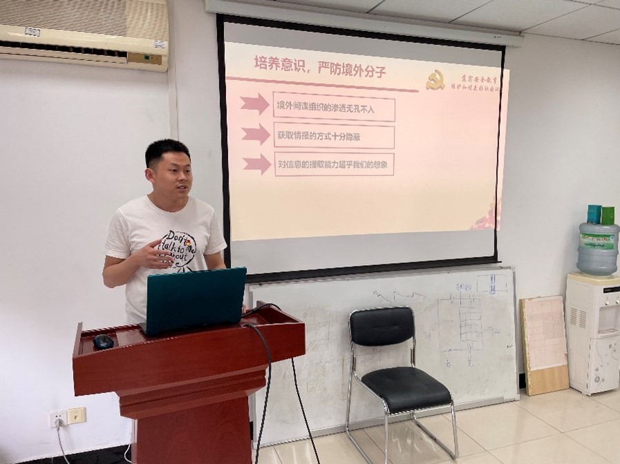 邓宇玄同志领学“安全意识不松懈,共筑国家安全线”相关内容时谈到,国家安全事件离我们并不遥远;国外间谍往往用我们难以理解的方式窃取国家机密,针对国家形势传播不当言论煽风点火,制造舆论影响群众。其间他对香港暴乱问题进行剖析,提醒我们应该时刻重视国家安全,最后总结到:我们应该坚持文化自信与制度自信,坚持维护国家安全,以身作则,为身边群众做出表率。