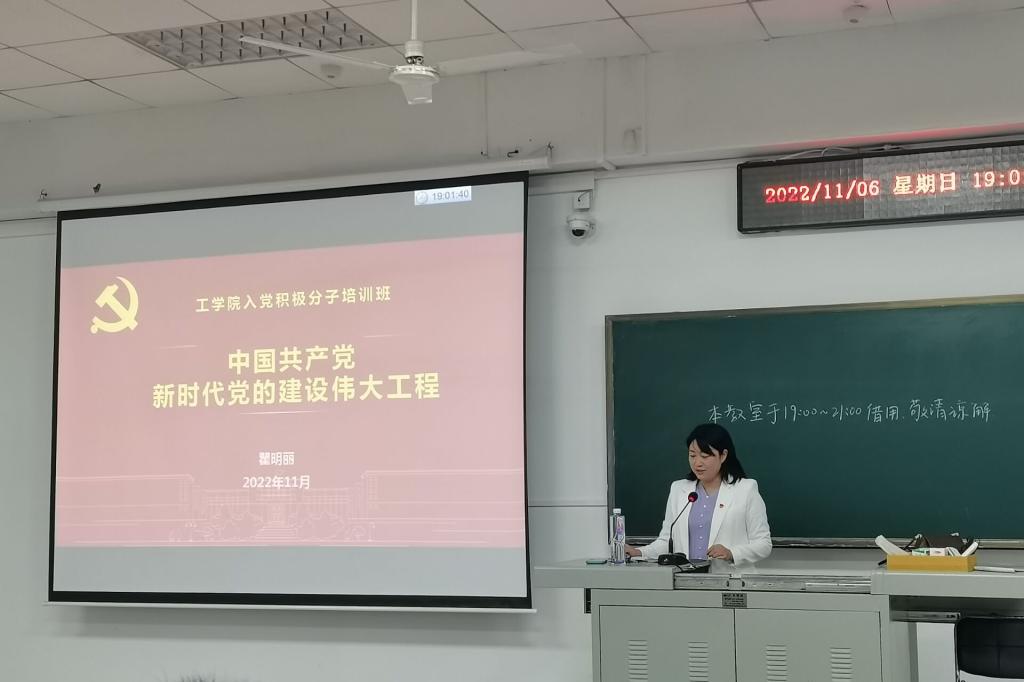 2022年11月6日晚上,太阳成tyc9728集团第82期入党积极分子第二次线下党课在三教C105进行,学院党委副书记瞿明丽同志为150余名入党积极分子讲授“中国共产党新时代党的建设新的伟大工程”专题党课。本次党课内容围绕党的建设伟大工程形成发展及其重大意义、新时代党的建设的总要求与主要内容、推进党的建设新的伟大工程的实践与启示等三个方面进行。