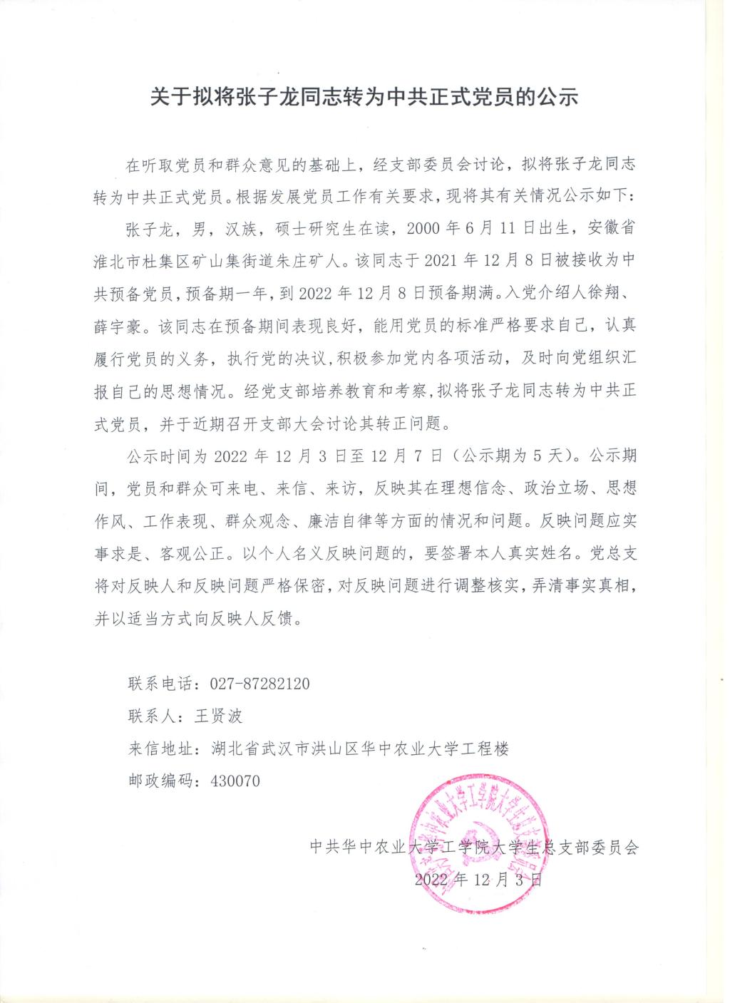 【研】关于拟将张子龙同志转为中共正式党员的公示