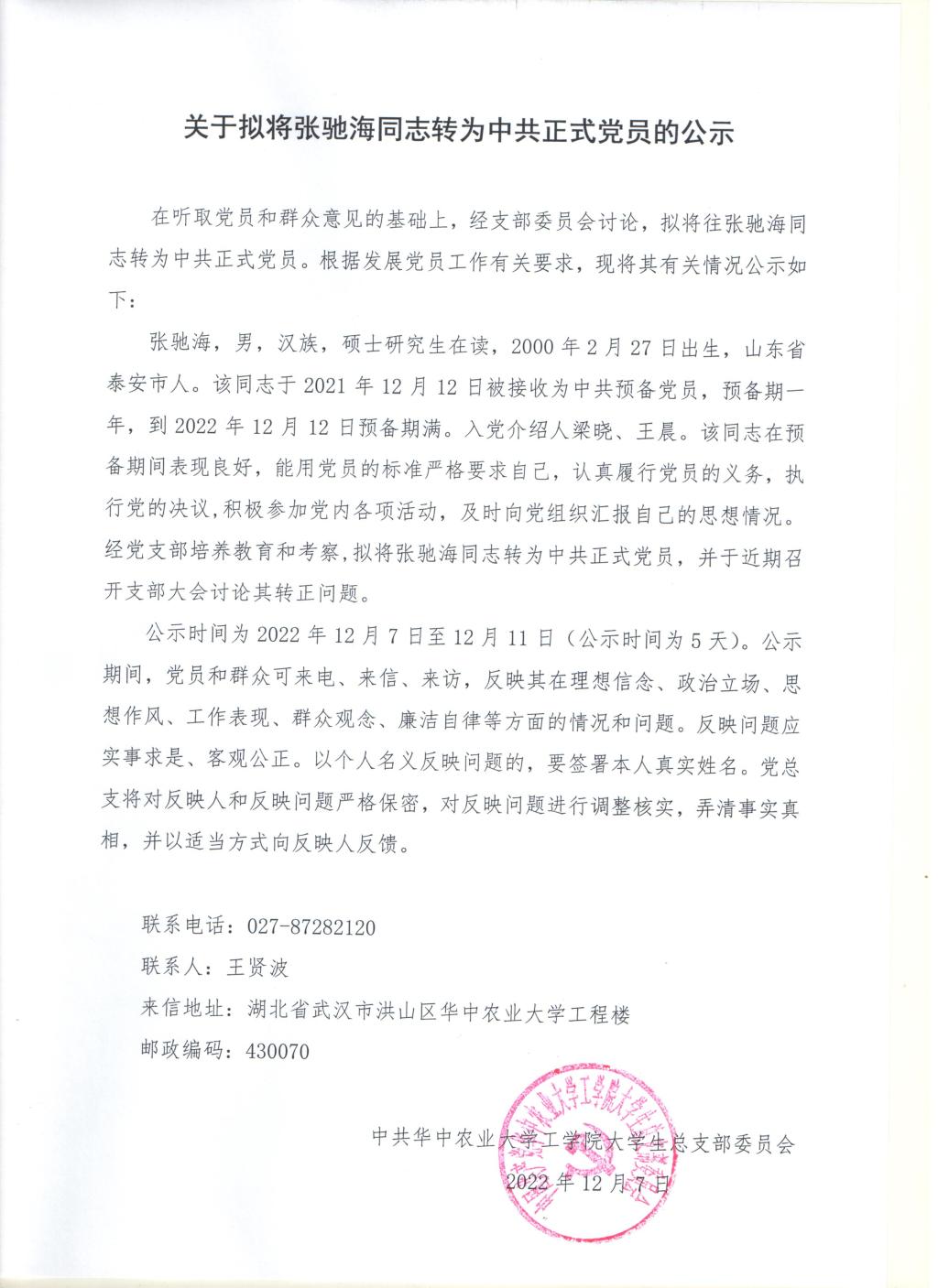 【研】关于拟将张驰海同志转为中共正式党员的公示