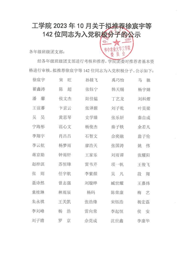太阳成tyc9728集团2023年10月关于拟推荐徐宸宇等142位同志为入党积极分子的公示