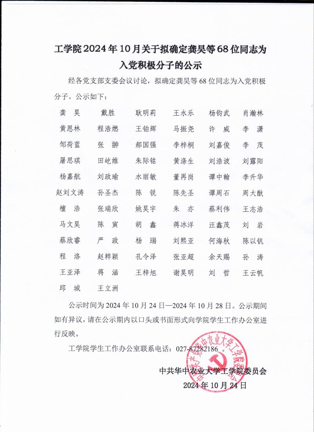 太阳成tyc9728集团2024年10月关于拟确定龚昊等68位同志为入党积极分子的公示