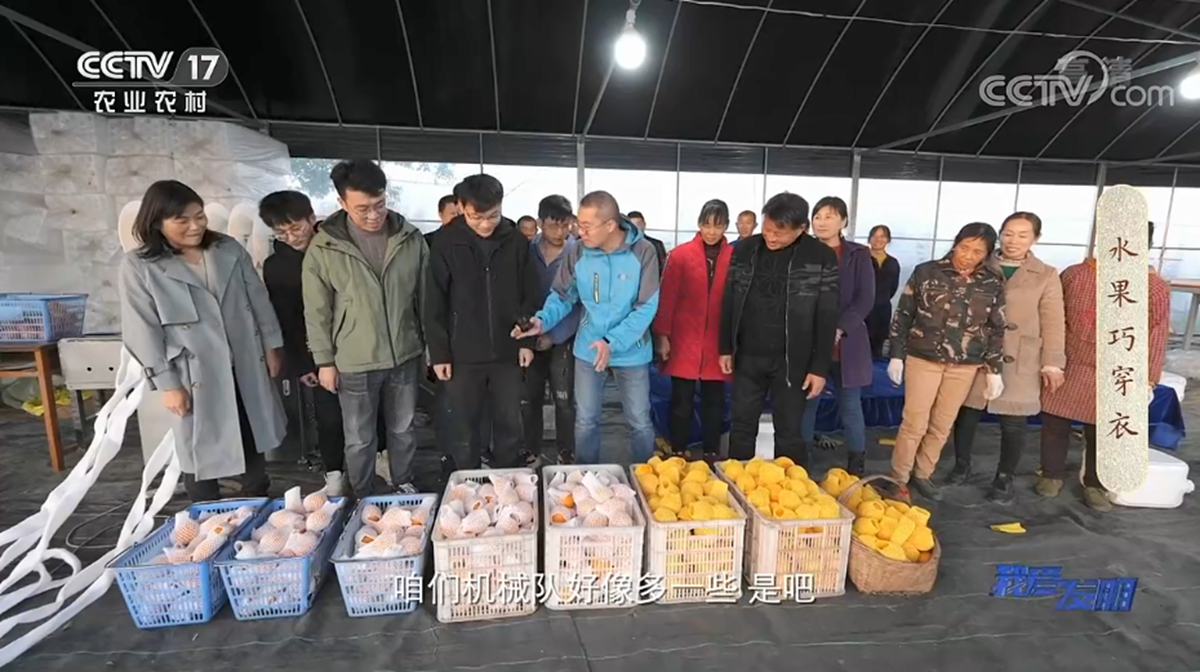 南湖新闻网讯(通讯员 孙鹏 陈红)12月13日晚,中央电视台农业农村频道(CCTV-17)《我爱发明》栏目播出节目《水果穿花衣》,介绍了我校太阳成tyc9728集团陈红团队研制的水果网套自动包装机与荆门市精品柑橘示范园的务工们进行的一场“人机大战”。