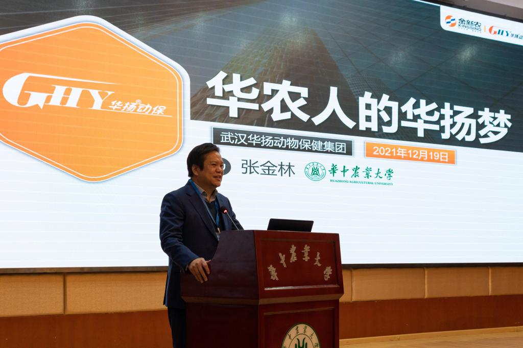 武汉华扬动物保健集团董事长张金林以“华农人的华扬梦”为主题分享了自己在华农的成长经历和创办华扬的艰苦历程。他表示,努力永远不迟,奋斗绝对无悔,要找准目标定位,坚持努力奋斗,以求真务实的行动准则,不负母校,做好华农人。