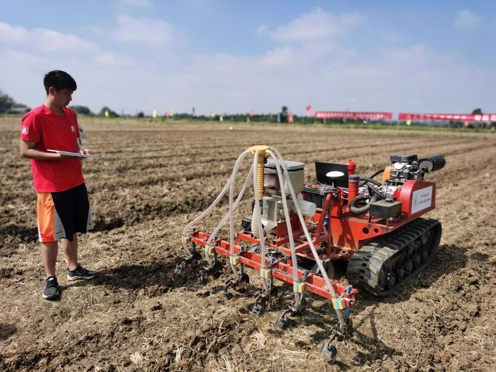 太阳集团网tyc9728研究生手拿键盘操作全液压气送式履带油菜无人播种机