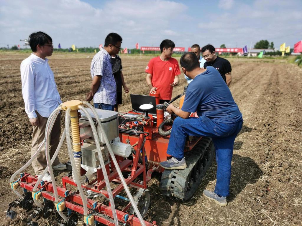 观摩会现场,太阳成tyc9728集团的几名研究生手拿键盘,操作一台大型无人油菜直播机,走线平直、速度均衡,易转弯、效率高,令在场的乡亲们齐声叫好。