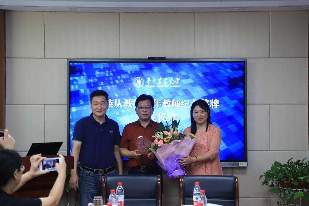 在从教三十年教师纪念奖牌颁发仪式上,院长廖庆喜回顾了自己三十多年的工作经历,分享了自己在教育教学、科学研究和管理服务等方面的感受和经验。他谈到,教师肩负重要使命,要想教好书育好人,首先要学会做人,要尽自己最大努力让学生收获知识与成长,要让学生的满意成为我们的最大幸福。他结合自身成长经历谈到,科研是教师的基础工作,实践出真知,每位老师都要深入生产生活一线,在实践生产和产业需求中找到研究方向和目标,切实让科研服务社会发展进步。他谈到,管理服务工作最重要的是用心和用情,每一项工作的向前推进,都要考虑到对各方面的影响和全院师生的感受,要营造良好的工作环境,为师生增添更多幸福感。他表示,只有学院的氛围好,学院师生团结奋斗,个人才能安心工作,生活幸福,他希望全院师生共同努力,传承好学院温暖的工作氛围和文化,推动学院事业不断进步发展。