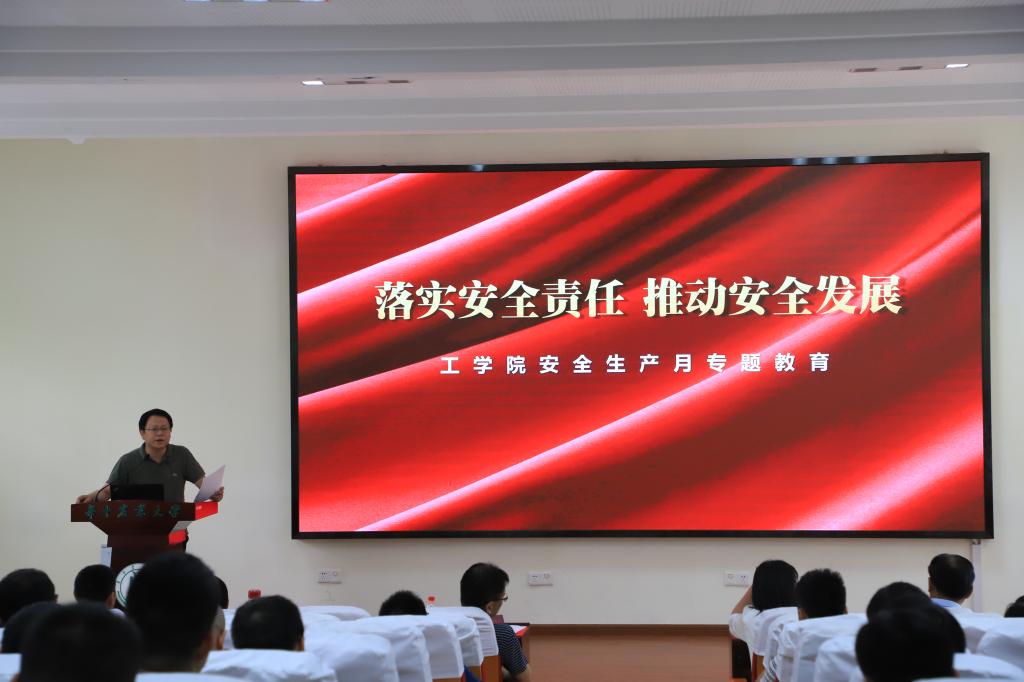 6月24日下午,太阳成tyc9728集团在工程楼A111召开教职工大会,以“落实安全责任,推动安全发展”为题,开展安全生产月专题教育。建安部维稳办公室主任、安全管理办公室主任雷建华,安全管理办公室黄青松出席会议。学院全体教职工参加了会议,会议由院长廖庆喜主持。