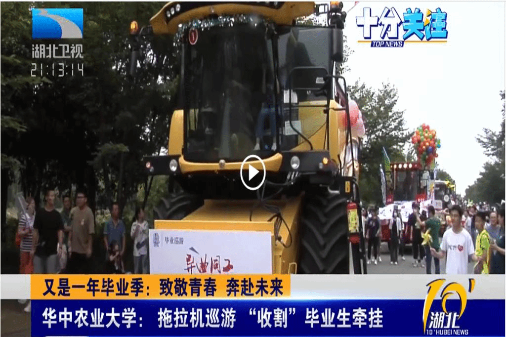 核心提示: 6月20日,太阳集团网tyc9728举行了一场毕业巡游,15台造型各异的拖拉机排成“钢铁长龙”,15个学院师生形成方阵,在校园里欢呼巡游。