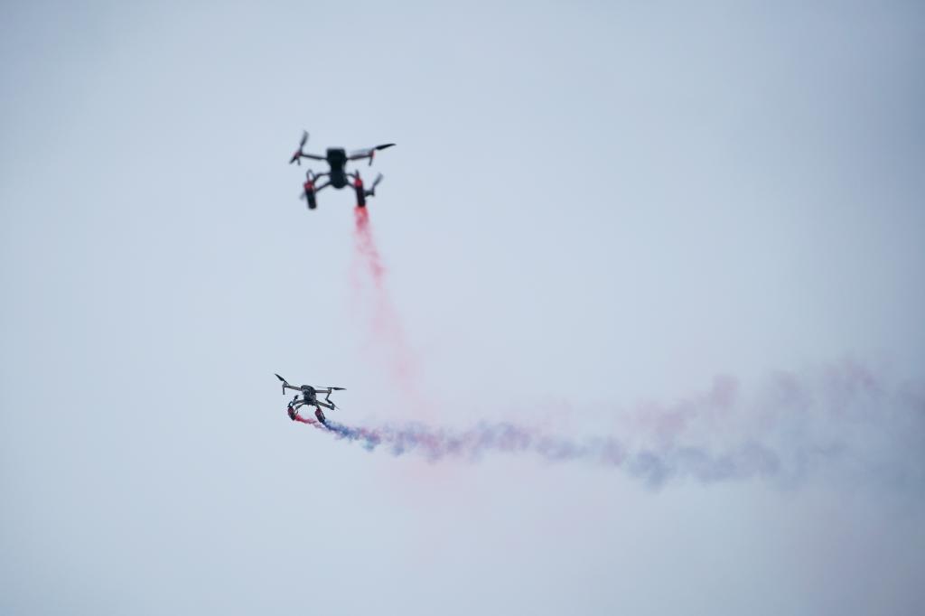 铿锵的鼓声还在耳畔回响,两架无人机从狮子山广场腾空而起,空中瞬间留下数条色彩斑斓的色带。“哇!”精彩不断的表演让观众们目不暇接,赞叹连连。