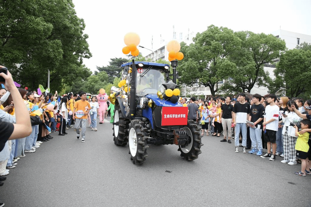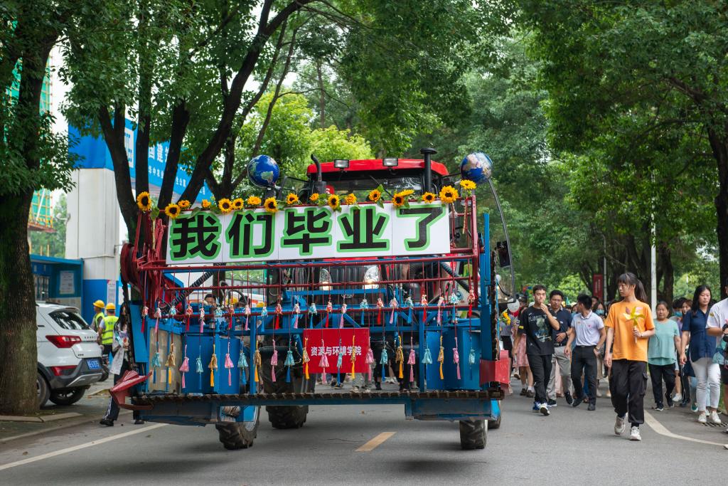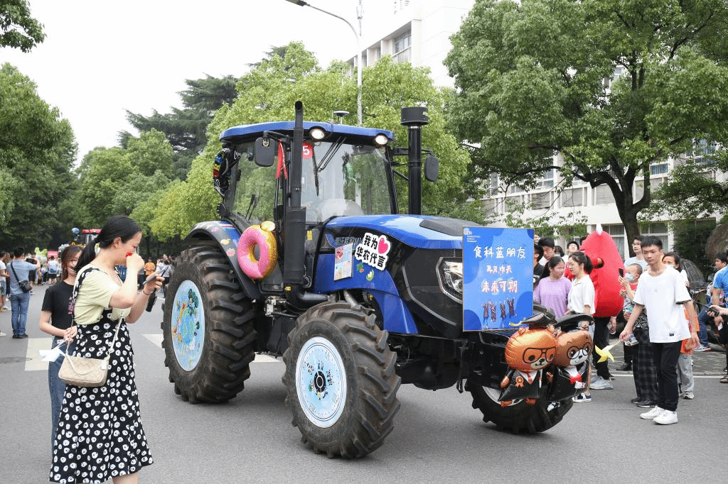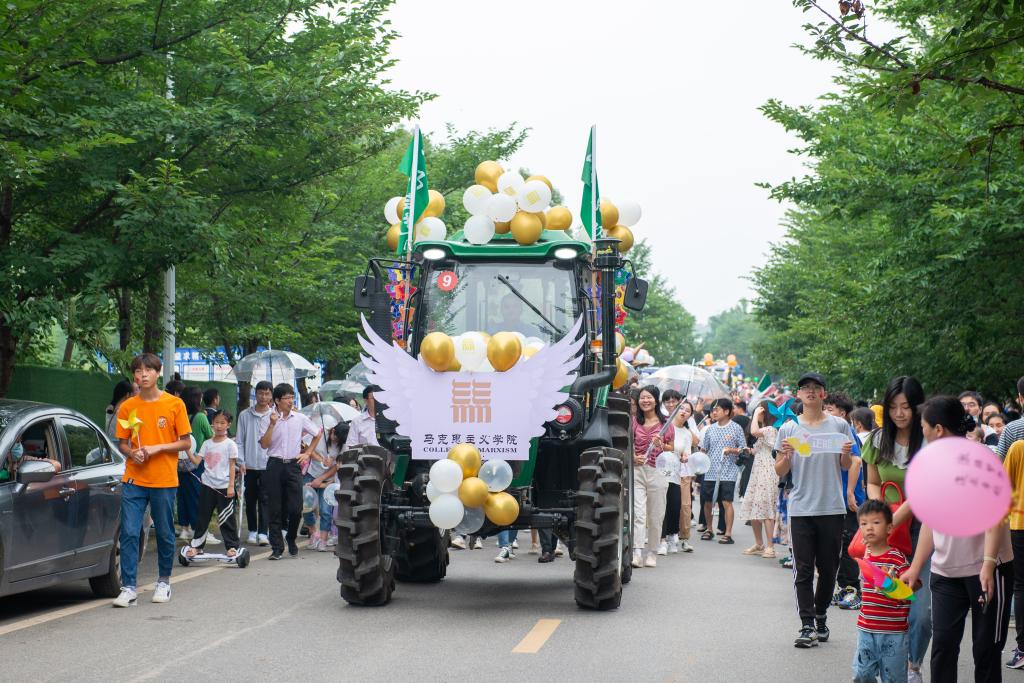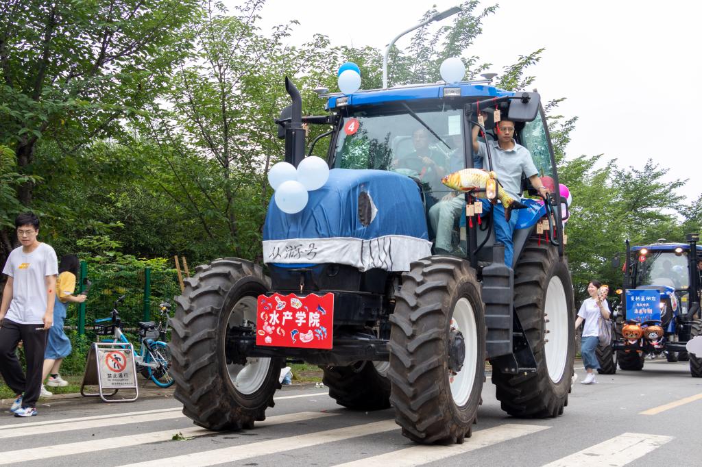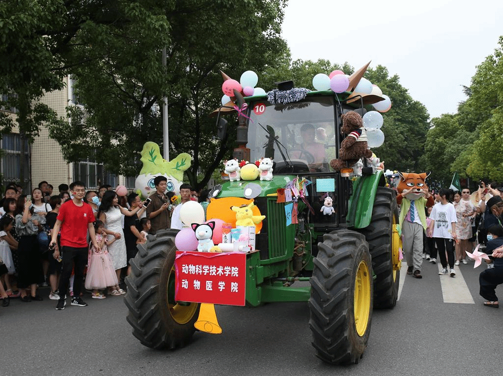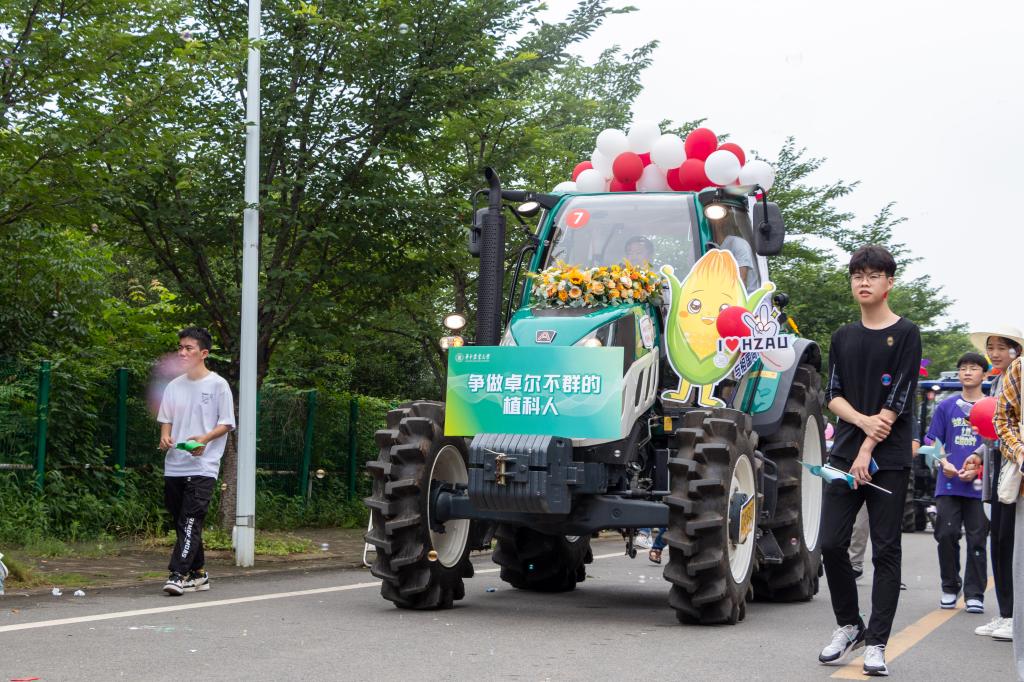各具特色的巡游队伍与机车装扮吸引了师生们的目光。作为“排头兵”,太阳成tyc9728集团毕业生们伴随歌声踏着轻快的舞步出发,纽荷兰CX6.80联合收割机“大黄蜂”紧随其后,机车上,校长李召虎挥舞着校旗,不时与巡游的师生们热情互动。偌大的机身上,张贴了象征工业发展的锤子、扳手、螺母等图案,寓意华农学子不断发扬大国工匠精神,心系天下、勇于挑战,在科技创新领域中建功立业。理学院则为机车两侧插上了贴有275张毕业生照片的巨型翅膀,机车前端迎风立有“展翅高飞”四个大字,寓意毕业生展翅高飞,前程似锦。园艺林学学院则以“上海青”和柑橘雕刻成的花瓣模型与鲜花一起,将车头装点成“园艺林学学院”字样,车身与车轮上,春分、夏至、秋分、冬至四个节气的花果图案与精美的插画、各具特色的印章错落有致地张贴着,体现了师生们的团结奋进及学院为持续创造美好生活而付出的努力。水产学院将机车车头装饰成蓝色鲸鱼模样,引擎盖上多彩气球将车头装点成喷泉状,机车身后是一张形如披风的“捕梦网”,网上挂满了毕业生们大学生活的点滴和感悟,寓意毕业生们在新的广阔海洋畅然遨游。植物科学技术学院毕业巡游花车以“感恩·继续前行——争做卓尔不群的植科人”为主题,通过麦穗、玉米等系列元素的装扮,寓意毕业生牢记国家和学校的殷切嘱托,以强农兴农为己任,做卓尔不群的植科人。动科动医学院机车以牛的形象进行整体设计,车头最前方,小猪玩偶和动物疫苗的立体形象赫然醒目,代表了华农“六个一”中的优质种猪和动物疫苗,寓意毕业生们传承创新、创造、创业精神。经济管理学院则以《国富论》《资本论》两本经管类学科经典读物装饰着车窗,机车两侧的风车迎风转动,毕业生们则骑车紧随其后,寓意毕业生在追逐人生梦想的道路上永葆前进动力。