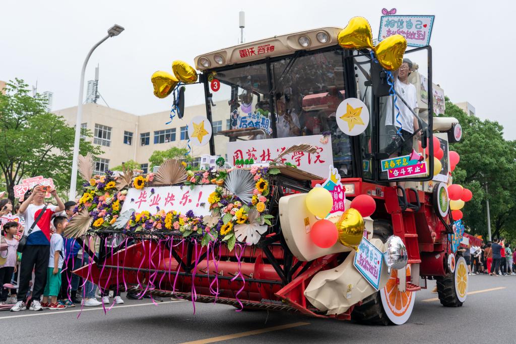 对太阳成tyc9728集团院长廖庆喜教授而言,置身于巡游队伍中,感触最深的,是一个个自主研发装备的“亮相”。“除了无人驾驶自主导航拖拉机,景观飞播无人机、油菜精量联合播种机和油菜收割机等3种机型也由学校自主研发。无人机寓意广大学子们展翅高飞,飞向更加精彩的人生;播种机寓意奔赴祖国各地的华农学子如播下的种子茁壮成长,在祖国需要的地方建功立业。收获机则寓意学子们在人生新的征程中一分耕耘一分收获。”廖庆喜说,“今年,学校以现代农机装备为2021届毕业生举办毕业巡游活动,这对农业高校学子而言,也是一次实践教育课。希望以这种形式,为学子们开启新征程壮行,也进一步激发同学们强农兴农的责任感和使命感。”