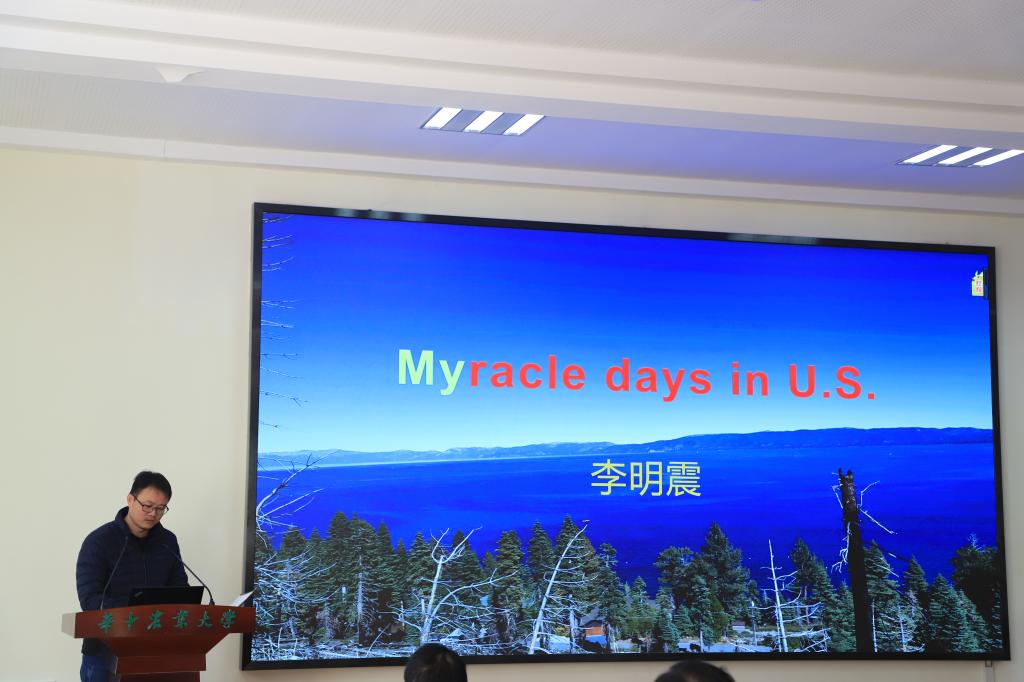 李明震以《Myracle days in U.S.》为题分享他在美国加州大学默塞德分校的学习经历。他以在美国考驾照的经历为切入点,从饮食文化、生活文化、科研文化等多个方面展示了中美生活的差异,并以小见大,和大家深入探讨了蕴藏在文化差异背后的哲学底蕴。新冠疫情爆发后,李明震滞留美国,心情焦虑,在最难熬的时候是中国驻美大使馆的帮助让他得以顺利获取防疫物资,并顺利回到中国。出国的经历让他对祖国的热爱和归属感更加强烈,他也将把这种深深的爱国情感传递给他的学生,鼓励他们好好科研,成为祖国高质量人才,为建设祖国而努力。
