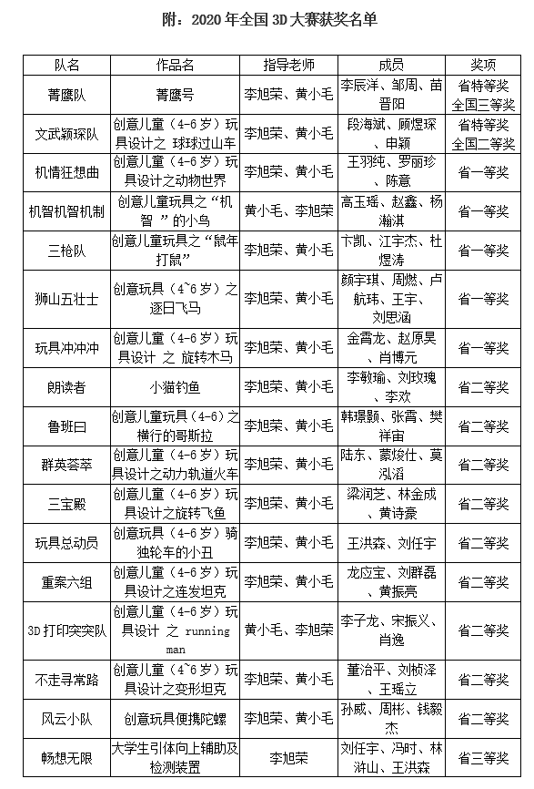 核心提示:2020年12月5日至8日,第13届全国3D大赛年度总决赛隆重举行。经过激烈角逐,我校师生在3D打印创新创意设计大赛中斩获佳绩,两支参赛代表队伍分别荣获全国二等奖和全国三等奖。