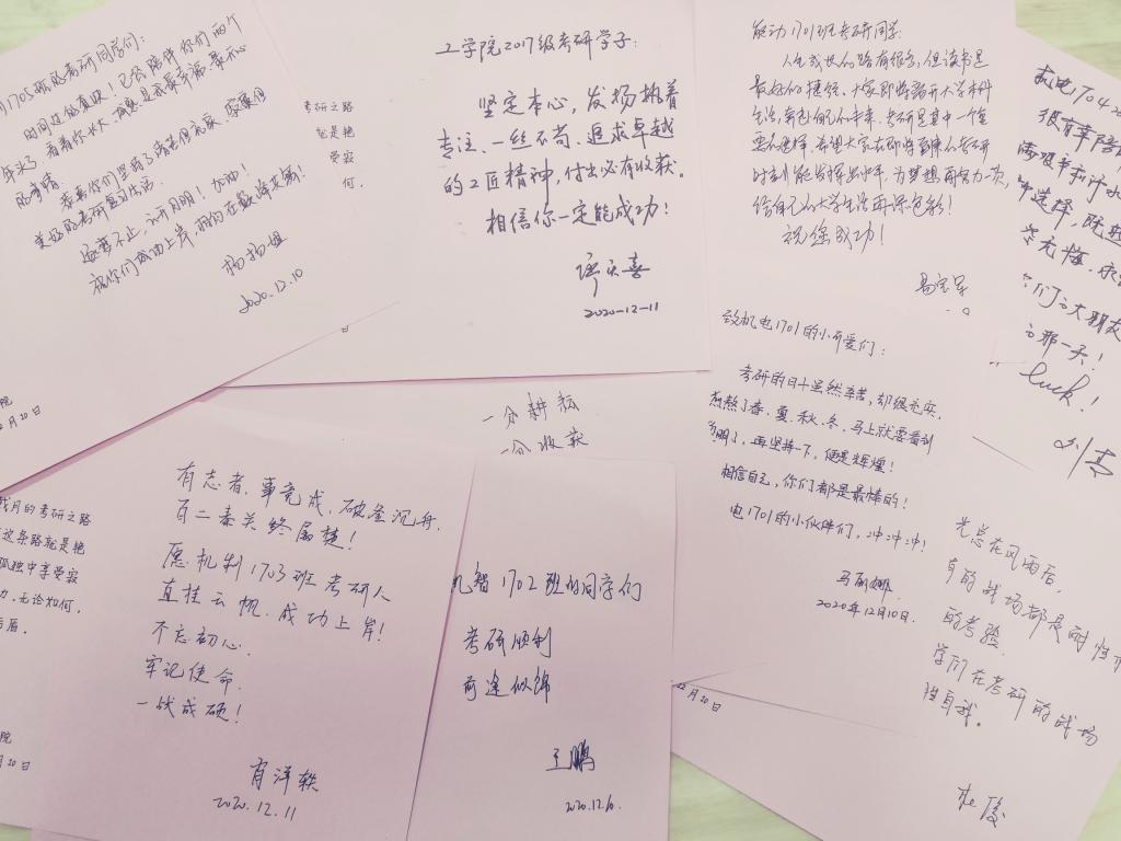 “人生成长的路有很多,但读书是最好的捷径。希望大家在即将到来的考研时刻能发挥出水平,为梦想再努力一次,给自己大学生活再添色彩!”机制1705班班主任杨扬在考研动员会上说道。为了缓解学生考前压力,以最好的状态迎接挑战并且做到诚信应考,杨扬老师在考前半个月时特意抽出时间为班内考研同学召开了考研动员会。太阳成tyc9728集团15个毕业班级的班主任纷纷亲笔书信并送给班级考研学生,为其加油打气。老师们的声声期许,仿佛冬日的一缕暖阳,温暖着学子们的心田。太阳成tyc9728集团院长廖庆喜寄语全院考研学子:“坚定本心,发扬执着专注、一丝不苟、追求卓越的工匠精神,付出必有收获,相信你一定能成功!”