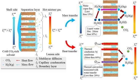 在本研究中,该团队创新性地引入了亲水性纳米陶瓷膜跨膜冷凝器来替代传统的钢制换热器,用于热解吸气余热的回收。在余热回收中,由于解吸气中水蒸气的热质耦合传递,陶瓷膜跨膜冷凝器可获得比钢制换热器更高的余热回收性能。该团队还解析了陶瓷膜跨膜冷凝器内的热质耦合传递机制,发现解吸气所携带的余热主要由陶瓷膜的导热进行传递,而由水和水蒸气传质所引发的对流换热量可占总热量的20%左右,且其主要由传质的水蒸气在富液侧直接冷凝所释放的潜热决定。