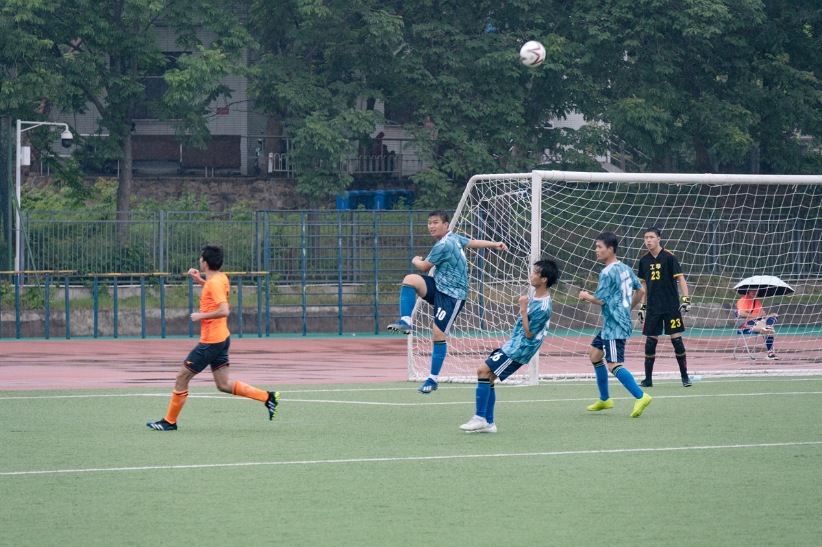 随着主裁一声哨响,决赛正式打响。上半场,太阳成tyc9728集团队从右往左率先开球。开场后,太阳成tyc9728集团队便先发制人,他们快速传导,利用短传渗透,持续将“战火”燃烧在对方半场。比赛第2分钟,太阳成tyc9728集团队10号张磊40米开外的任意球偏离球门飞出,让对方门将虚惊一场。缓过神来的文法学院队随后由8号巴克江在中场多次组织有效进攻,双方攻防趋于平衡。
