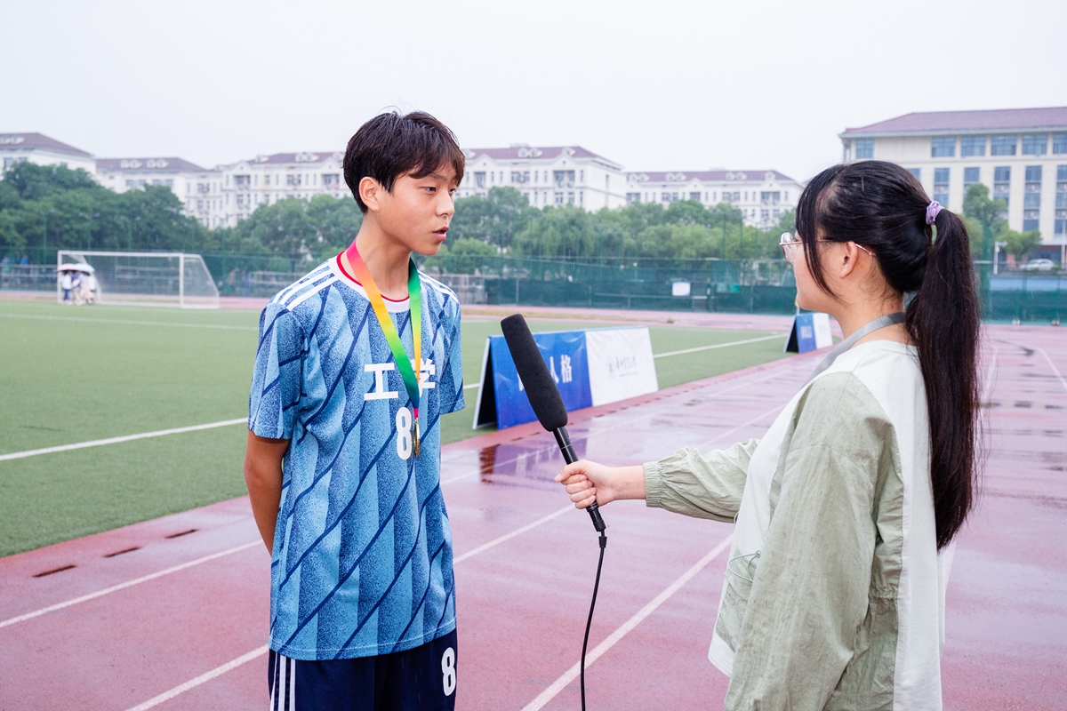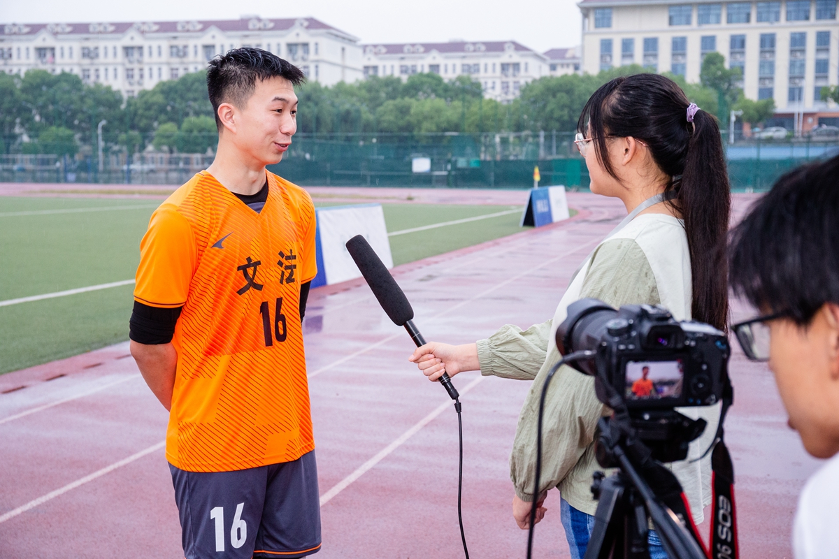 文法学院男足队员杨恣懿赛后接受记者采访(侯国涛 摄)
