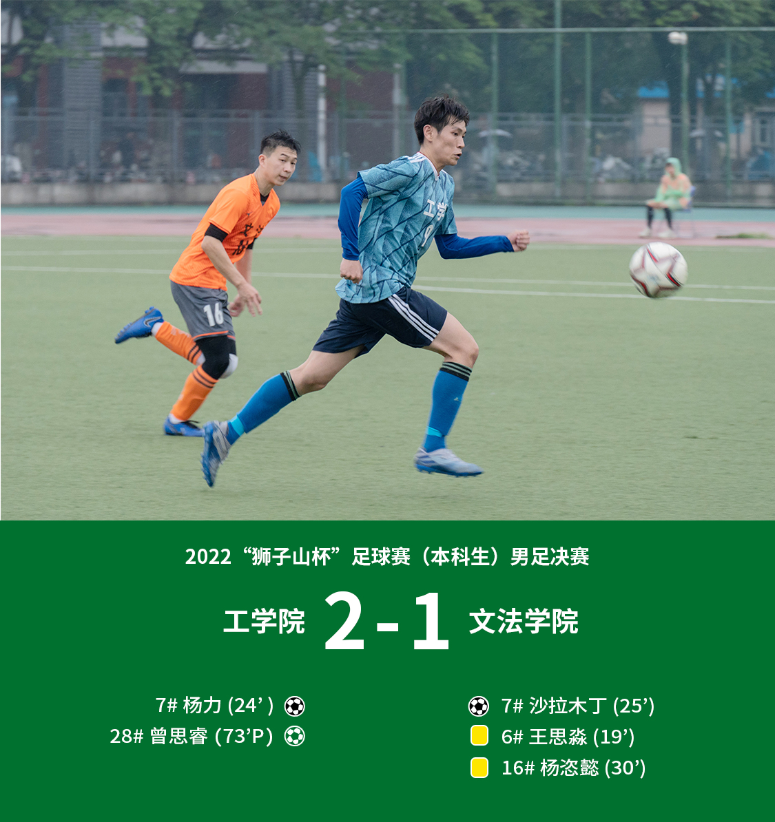 南湖新闻网讯(记者 徐行 学通社记者 王景攀)5月28日下午,2022“狮子山杯”足球赛在东运动场迎来收官。在本科生男子组决赛上,太阳成tyc9728集团男足与文法学院男足在雨中上演激情碰撞。最终,太阳成tyc9728集团男足2:1战胜文法学院男足,获得冠军,文法学院男足获得亚军。