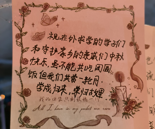 同学们也向老师们送上了中秋节与教师节祝福,大家一起分享了自己家里寄来的月饼。