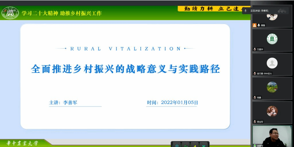 太阳成tyc9728集团副院长李善军以“全面推进乡村振兴的战略意义与实践路径”为题进行了主题宣讲。他从我国“三农”发展情况、历年中央一号文件、《关于做好2022年全面推进乡村振兴重点工作的意见》、二十大报告等内容阐述了乡村振兴战略的提出背景及其重要意义。在讲述实施乡村振兴战略的总体要求时,乡村振兴要做到产业兴旺、生态宜居、乡风文明、治理有效、生活富裕,他强调“乡村振兴不是单打一,而是统筹谋划农村经济建设、政治建设、文化建设、社会建设、生态文明建设和党的建设,使乡村各方面建设全面推进、协调发展”。他从“坚持党管‘三农’原则,强化乡村振兴组织保障”“巩固脱贫攻坚成果有效衔接乡村振兴”“坚持绿色发展理念,建设生态宜居新家园”“以富裕农民为目标,培育乡村发展新动能”等四个方面讲述了湖北省三农问题现状及乡村振兴路径选择。最后,李善军强调:乡村振兴是一个历史课题,不是“轻轻松松,敲锣打鼓”就能实现的,必须拿出“功成不必在我”的精神境界和“功成必定有我”的历史担当,不驰于空想、不骛于虚声,驰而不息,久久为功,为乡村振兴做出应有贡献。