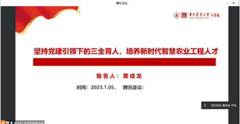 机电工程系教工党支部书记黄成龙以“坚持党建引领下的三全育人,培养新时代智慧农业工程人才”为题进行了主题宣讲。他结合党的二十大报告精神,从“实施科教兴国战略,强化现代化建设人才支撑”“没有农业农村现代化,就没有整个国家现代化”和“农业高层次人才培养大有可为”三个方面阐述了开展智慧农业研究的重要意义。他谈到,传统的农业生产方式正在被逐步取代,农业大数据的发展正在推动农业向智能化方向发展,培养智慧农业工程创新型和复合型人才是推进智慧农业发展的关键。他从科学应“变”,对接农业现代化发展需要;立足于“新”,推动多学科交叉融合;聚焦提“能”,构建协同育人共同体三个方面详细介绍了培养新时代智慧农业工程人才的路径探索。
