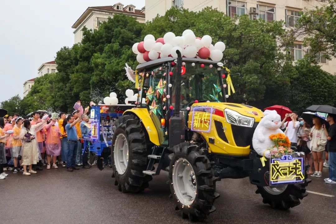 傍晚时分,雨花纷扬,蝉鸣阵阵,工科基地旁早已人山人海,由各学院精心装扮的15辆现代农机装备组成“钢铁长龙”阵列待发。伴随现场主持人的介绍,现场气氛逐渐被点燃。