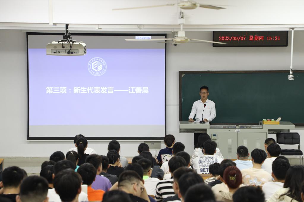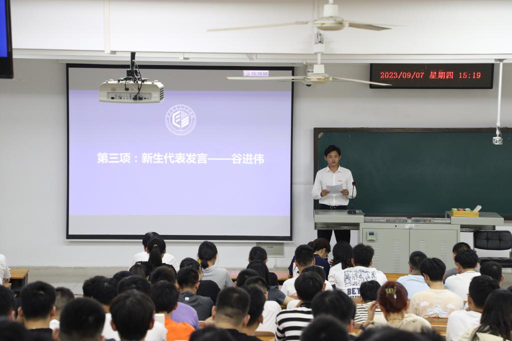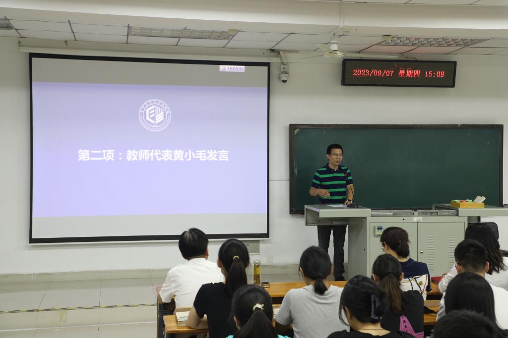 黄小毛教授作为教师代表发言。他和2023级新生们分享了三句话。一是“让自己满意、对自己负责。”要反复迭代优化,精进奋进,让自己和内部知情人满意,对自己和信任你的人高度负责。二是“尽快转变角色,适应研究生阶段的学习和生活。”要尽快转变观念,主动熟悉导师的研究方向和领域,确定攻关方向,做到实干为先。三是“学会沟通,积极主动交流,发挥团队优势。”要设身处地换位思考,形成“双向互动反馈”,达到“积极有效沟通”的目标。他号召同学们争做一个精进靠谱的人,心存敬畏、不忘初心、奋发有为,既脚踏实地,又仰望星空,在乡村振兴、装备强农的伟大征程上,争做一位工字型的农业工程领域相关问题解决专家。