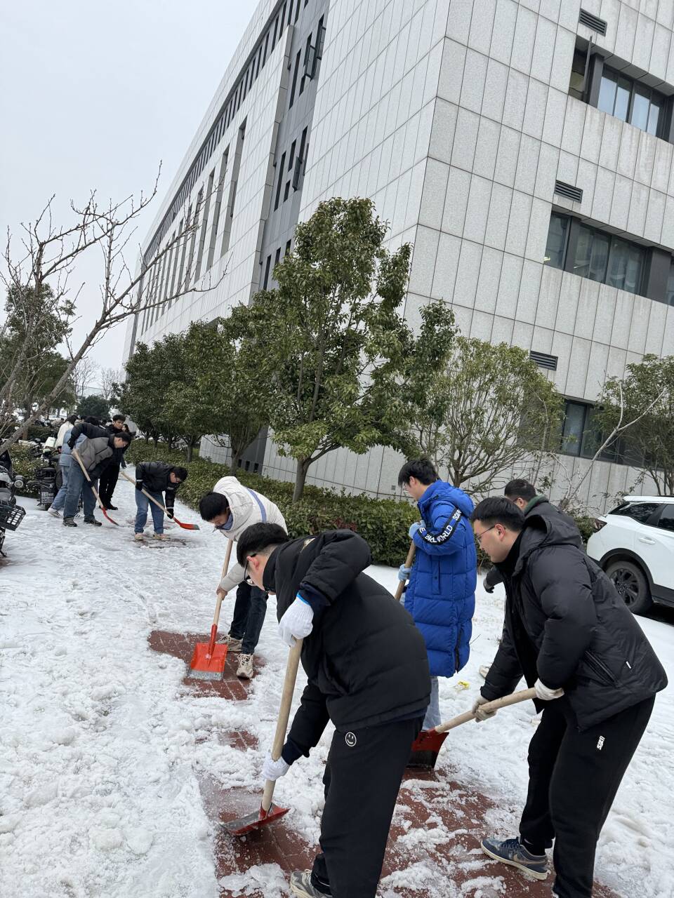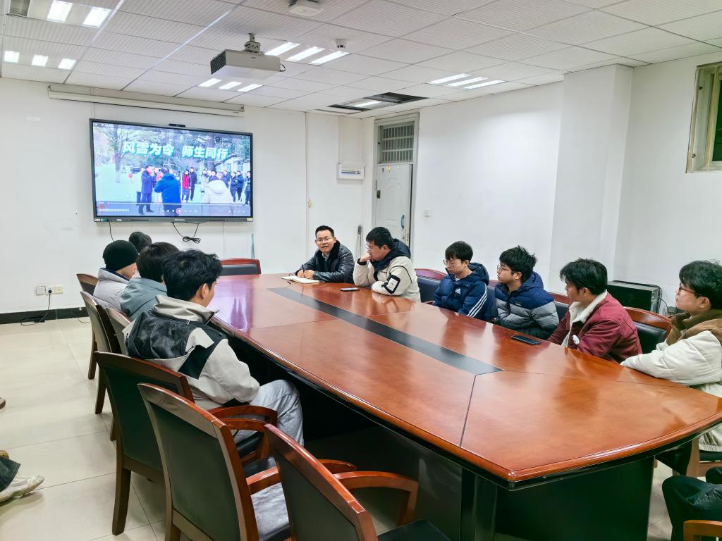 在班会开始前,油菜机械化生产技术与装备团队1班同学们在廖宜涛教授的带领下对新工科楼下人行道的雪进行了清理,为开来往行人铲出一条可安全通行的道路。廖宜涛对同学们铲雪的辛苦付出表示感谢,他谈道:“新年伊始,我们也进入了新的一轮研究进程,希望各位同学能够多和老师及师兄师姐请教,掌握研究规律,把握自身节奏。”