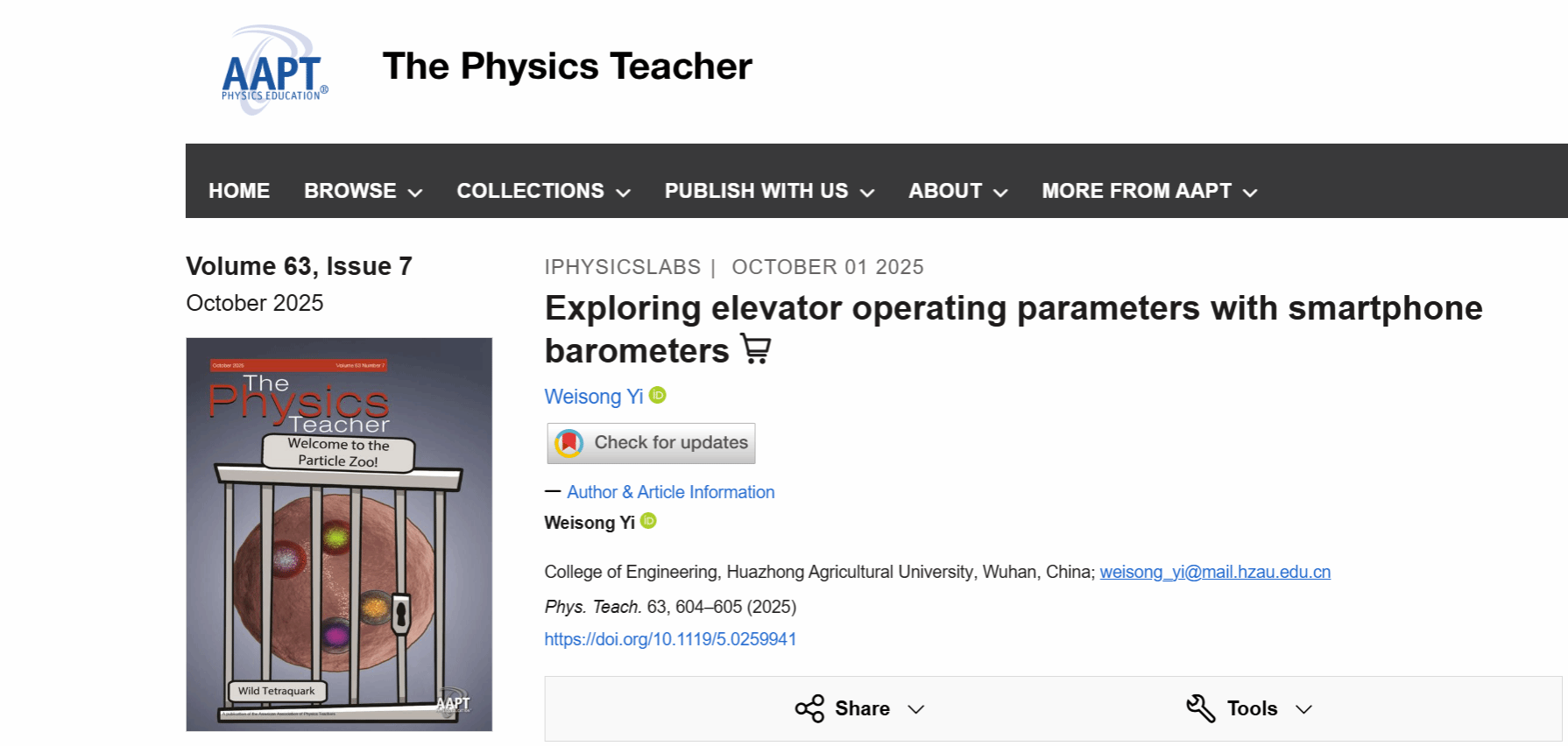 近日,我院大学物理教学团队在《The Physics Teacher》发表了题为“Exploring elevator operating parameters with smartphone barometers”(Weisong Yi, 2025, Phys. Teach. 63, 604–605.)的物理实验教学研究论文。《The Physics Teacher》是由美国物理教师协会(The American Association of Physics Teachers,简称AAPT)主办的国际知名物理教育教学类期刊,为物理教育研究领域唯一的SCI收录期刊,具有非常高的学术影响力。