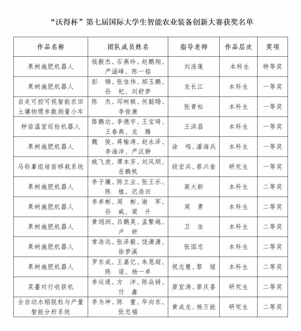 近日,“沃得杯”第七届国际大学生智能农业装备创新大赛决赛在江苏大学落下帷幕,来自国内59所高校的500余支队伍参赛,经过专家评审、线上问辩和线上竞技等环节的激烈角逐,我院学子共获特等奖1项(全国24项),一等奖5项(全国50项),二等奖7项(全国95项),我校荣获大赛先进组织单位(全国共评选10家单位)。